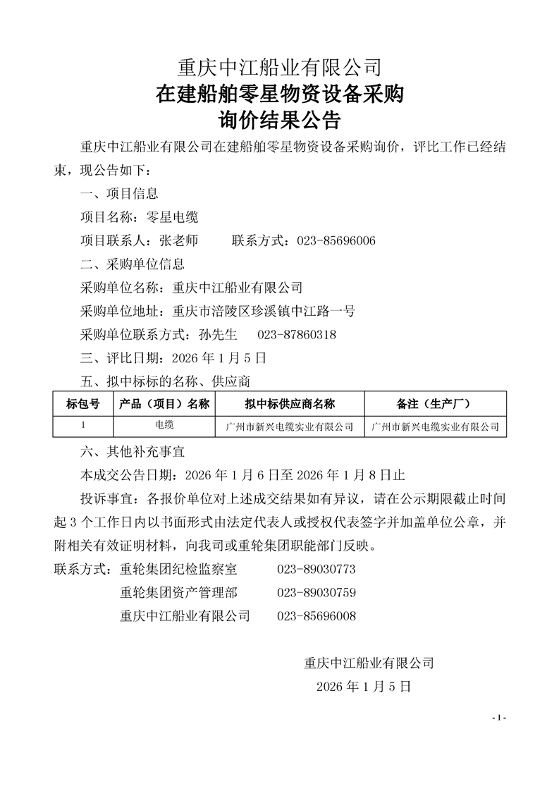中江船業(yè)在建船舶零星物資設(shè)備采購詢價結(jié)果公告