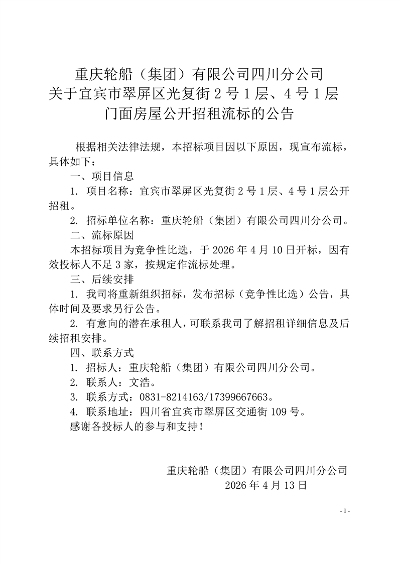 四川分公司關(guān)于宜賓市翠屏區(qū)光復(fù)街2號1層、4號1層 門面房屋公開招租流標(biāo)的公告
